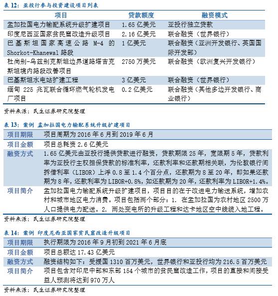 截至2016年9月底,亚投行一共公布了该行参与投资建设的两批六个项目,项目贷款额总计8.29亿美元,涉及孟加拉国、印度尼西亚、巴基斯坦、塔吉克斯坦和缅甸五个国家,涵盖了能源、交通和城市发展等领域。六个项目中,除了孟加拉国的电力输送升级和扩容项目为亚投行独立提供贷款的项目,其余项目计划与世界银行、亚洲开发银行、欧洲复兴开发银行等其他多边开发银行以及商业银行进行联合融资。