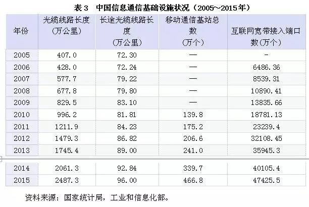 20世纪80年代以来,特别是进入21世纪以来,中国的信息通信基础设施建设取得了长足进展。①在“信息高速公路”建设方面,截至2015年底,全国光缆线路总长度达到2487.3万公里,是2005年407万公里的6倍多。其中,2015年底全国长途光缆线路长度为96万公里,比2005的72.3万公里增加了33%。②在移动通信设施建设方面,2015年底,全国移动通信基站总数达466.8万个,是2010年139.8万个的3倍多。其中,2015年底3G/4G基站数达320.7万个,占移动通信基站总数的比例近70%,比2010年提高了35个百分点。③在互联网宽带接入端口方面,2015年全国互联网宽带接入端口数量达到4.7亿个,是2006年6486.36万个的7倍多(见表3)。特别是,互联网宽带接入端口“光进铜退”趋势更加明显,2015年各种类型数字用户线路(xDSL)端口比2014年减少3903.7万个,总数降至9870.5万个,占互联网接入端口的比重由2014年的34.3%下降至20.8%;2015年光纤接入端口比2014年净增1.06亿个,达到2.69亿个,占比由2014年的40.6%提升至56.7%。