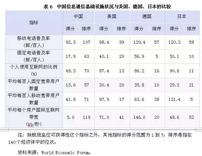 20世纪90年代以来,以“信息高速公路”为主要内容的信息通信基础设施成为发达国家的建设重点。虽然中国也加大了对相关领域的投入,但在传统电信运营商主导建设、政府财政性投入不足等因素的影响下,中国信息通信基础设施明显落后于发达国家,目前也无法有效满足社会生产生活的需求。①从移动电话普及率、固定电话普及率、个人使用互联网的比例等指标间接判断信息通信基础设施建设在促进信息社会形成方面的效果看,中国与美国、德国、日本存在一定差距。其中,在个人使用互联网的比例上差距最大。中国仅有49.3%的人使用互联网,在140个经济体中排在第70位,而美国、德国、日本分别有87.4%、86.2%、90.6%的个人使用互联网。②在宽带接入方面,中国的平均每百人固定宽带接入用户数量为13.6,比美国的30.4、德国的35.8、日本的29.3要低许多;中国的平均每百人移动宽带接入用户数量为41.8,与美国的97.9、德国的63.6、日本的121.4差距更大。③在宽带基础设施方面,中国平均每个用户的国际互联网带宽仅为5.0kb/秒,在140个经济体中排名第119位,远落后于美国、德国、日本(见表6)。综合判断,中国的信息通信基础设施全面落后于美国等发达国家,在信息通信基础设施已进入宽带和泛在连接新阶段的背景下,国际互联网带宽亟待升级。