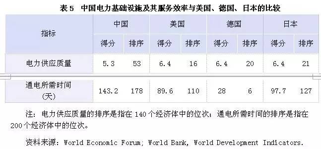 由于不同国家的幅员面积、能源资源禀赋不同,并且发展阶段、产业结构也存在差异,这使得各国对能源基础设施的要求也是不一样的。但是,电力作为现代社会不可或缺的能源投入,在生产生活中发挥着重要作用。因此,可以通过横向比较电力供应的质量来判断能源基础设施的发展水平。世界经济论坛发布的《2015~2016年全球竞争力报告》提供的数据显示,在电力供应质量方面,中国的得分是5.3分,在140个经济体中排在第53位,明显低于中国在全球竞争力指数中第28位的排名。美国、德国、日本这项指标的得分均为6.4分,与它们相比,中国的电力基础设施有待进一步发展。考虑到中国的发电装机规模已达到世界第一,并且近年来火电机组的年运行小时数不断下降,因此电力基础设施的主要瓶颈应该是电网,尤其是配电网。另外,还可以比较通电所需时间(time required to get electricity)来判断电力基础设施运营部门提供相关服务的效率。根据世界银行发布的世界发展指数,2015年,在中国通电所需时间为143.2天,远高于世界平均水平(97天),更高于上中等收入(upper middle income)国家的平均水平(90天),在全球200个经济体中排名第178位。而美国、德国、日本的通电所需时间分别是89.6天、28天、97.7天。尽管除德国之外,美国、日本在电力基础设施服务效率方面表现也很不好,分别排在第110位、第127位(见表5),但比中国仍然要高一些。由此可见,中国电力基础设施运营部门的服务效率还有很大的提升空间。