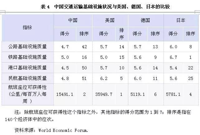 根据世界经济论坛发布的《2015~2016年全球竞争力报告》,交通基础设施及其服务的质量由5个分项指标来衡量,具体包括公路质量、铁路基础设施质量、港口基础设施质量、民航基础设施质量、航班座位可获得性(见表4)。①就公路交通基础设施及其服务的质量而言,中国的得分4.7分(满分为7分),在140个经济体中排在第42位。与中国4.9分的全球竞争力指数得分和第28位的排名相比,公路基础设施及其服务的质量明显是一个短板。横向比较,美国、德国、日本公路基础设施及其服务的得分是5.7分、5.7分、6.0分,分别排在第14位、第13位、第8位。中国与它们的差距也很大。②在铁路基础设施质量方面,中国的得分是5.0,排在第16位。这表明,经过近些年的高速发展,中国的铁路基础设施基本上已经突破了此前长期存在的瓶颈约束,较好地发挥了对中国经济社会发展的支撑作用。当然,也要看到,与德国、日本相比,中国的铁路基础设施质量还有一定的提升空间。③对于港口基础设施及其服务的质量来说,中国的得分是4.5分,排在第50位,并且与美国、德国、日本的差距较大。对于中国这样一个外贸依存度较高的国家而言,港口基础设施发展不足会带来明显的负面影响。④在民航基础设施领域,一方面,中国的民航基础设施质量得分是4.8分,排在第51位,与美国、德国、日本差距明显;另一方面,以每百人每周的民航线路里程衡量的航班座位可获得性,中国仅次于美国,在140个经济体中位居第二。在民航基础设施质量一般的情况下,中国很可能是通过增加航线密度等方式提高了航班座位的可获得性。从这个角度看,中国的民航基础设施应该还有较大发展空间。综合公路、铁路、港口、民航四类交通运输基础设施及其服务质量的比较结果可以明确,港口基础设施的差距最大,民航次之,公路第三,铁路基础设施的差距最小。