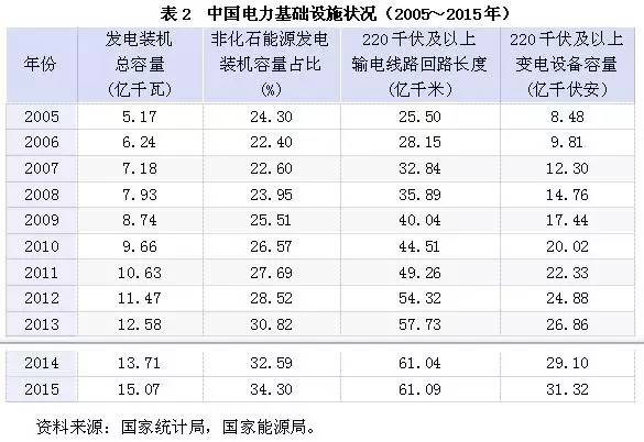 就电源设施而言,2015年底全国全口径发电装机容量15.07亿千瓦,居世界第一位。其中,非化石能源发电容量51642万千瓦,占总装机容量的34.3%;在非化石能源发电装机中,水电31937万千瓦,核电2717万千瓦,并网风电12830万千瓦,并网太阳能发电4158万千瓦。纵向比较,2005年中国发电装机总容量为5.17亿千瓦,10年间增长了近3倍(见表2);并网风电、并网太阳能发电更是高速发展,成为世界上可再生能源装机利用规模最大的国家。