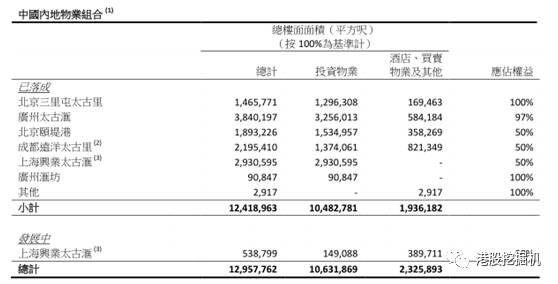 物业组合方面,于2017年6月30日,太古应占物业组合的总楼面面积约2930万平方呎,其中2660万平方尺是投资物业,包括已落成投资物业约2250万平方呎,及发展中或持作未来发展的投资物业约410万平方呎。