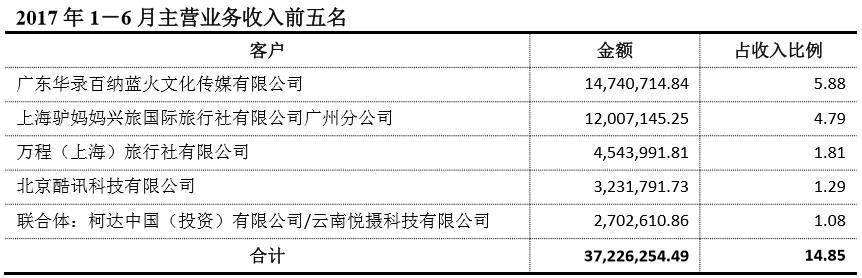 与2016年情况相似,在今年上半年2.51亿收入中,华录百纳蓝火和驴妈妈贡献最多,占收入比例分别为5.88%和4.79%: