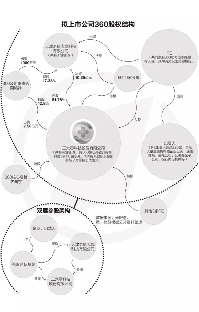 公开资料显示,360的拟上市主体为三六零科技股份有限公司,目前股东数量多达42家,其控股股东天津奇信志成科技有限公司(下称“奇信志成”)的出资人也多达37家,且两者的股东构成相似,即在直接入股360的同时,多数投资者也对控股股东出资,形成双层出资的独特架构。