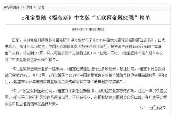 2015年8月18日,e租宝登陆《福布斯》中文版“中国互联网金融50强”榜单。