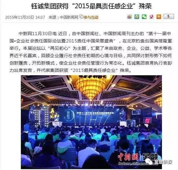 2015年11月27日,中国新闻社、中国新闻周刊 颁发钰诚集团“2015最具责任感企业”: