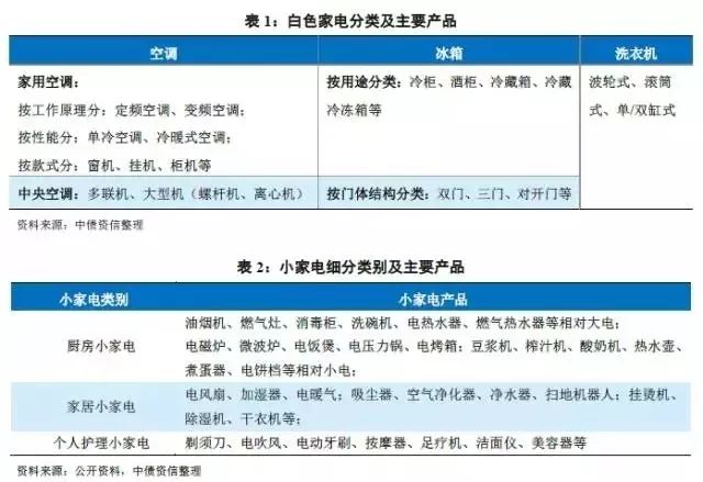 家用电器行业一般可细分为三个子行业:白色家电、黑色家电和小家电。白色家电一般指洗衣机、电冰箱、空调等(表1),最初以其白色外观得名;黑色家电一般指彩电,起源最早来源于采用珑管显示屏的电视机;小家电一般是指除了大功率输出的电器以外的家电,一般这些小家电都占用比较小的电力资源,或者机身体积也比较小,一般可分为厨房小家电、家居小家电和个人生活小家电三大类(表2)。
