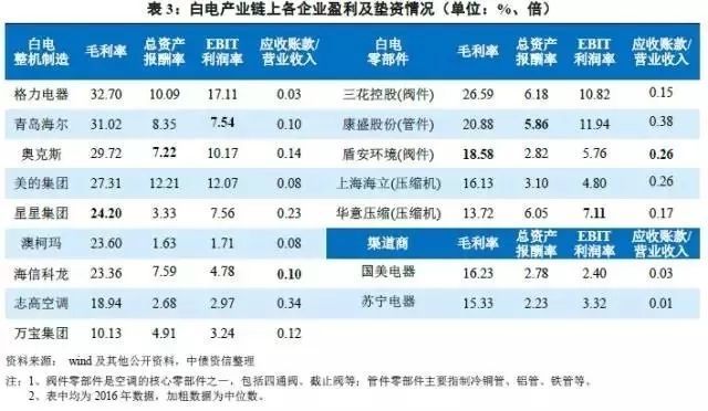 在白电产业链中,原材料供应商由于集中度很低,议价能力和盈利空间相对较低;零部件厂商中,虽然压缩机是最核心的部件,但由于白电巨头多自建产线,而压缩机行业存在结构产能过剩,除了由三花控股和盾安环境(虽然从市场份额来看盾安环境行业地位较强,但其运营效率不及三花股份,整体盈利能力和获现能力较弱)寡头垄断的阀件零部件市场,其他管件、板件等零部件厂商盈利能力仍弱于整机制造企业。我们选取了白电整机制造和零部件制造的部分代表企业进行分析,从表中可以看出,整机制造企业毛利率可高达32.70%,中位数为24.20%;零部件企业仅有三花控股达到26.59%,行业中位数则为18.58%;不同渠道商的盈利能力有所差异,以国美电器和苏宁电器为代表来看,其毛利率约为16%,略低于零部件企业。考虑到零部件制造、整机制造和渠道商的商业模式有所差异,我们用总资产报酬率和EBIT利润率再进行比较分析发现,渠道商的资产运营效率是显著低于整机制造和零部件制造企业的,而对于后两者而言,整机制造企业行业龙头的总资产报酬率和EBIT利润率均可高于10%,中位数分别为7.22%和7.54%,而零部件制造企业行业龙头的总资产报酬率和EBIT利润率约为6%左右,中位数则分别为5.86%和7.11%。由此可以看出,整机制造环节的盈利能力整体是优于零部件制造环节的。