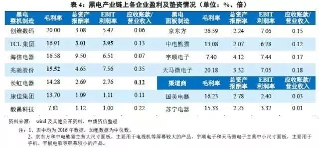 整体来看,黑电的技术革新速度快于白电行业,由于国内液晶面板制造企业数量较少,具有一定市场地位的仅华星光电、京东方和中电熊猫等几家,从毛利率和EBIT利润率表现即可看出,我国整机制造企业对中游面板及模组生产企业的议价能力偏弱(国内目前仅TCL集团实现了面板+整机产业链);不过,由于液晶面板产线投资规模远大于整机制造企业,面板制造企业的总资产报酬率相对弱于整机制造企业。从更上游来看,液晶面板的核心原材料——玻璃基板的生产技术仍掌握在国外企业手中,国内面板及模组生产企业对上游玻璃基板等原材料制造商的议价能力也偏弱。相比白电而言,黑电行业技术革新速度较快,且国内整机制造厂商未掌握上游核心技术,因此黑电企业整体抗风险能力弱于白电企业。