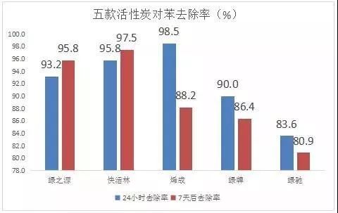 结果显示:绿之源、快活林、烯成、绿牌四个品牌的样品对室内有毒有害物质(甲醛、苯、甲苯、二甲苯、TVOC)的24小时去除率高达90%以上,净化效果理想。