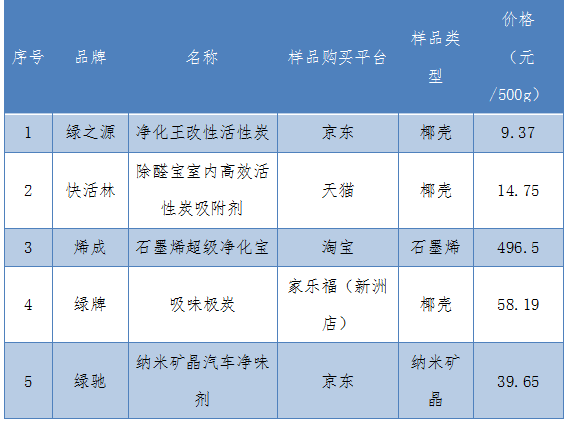 深圳消委会工作人员在京东、天猫、实体超市等渠道购买了热卖的5个品牌活性炭,涉及的活性炭产品包括:椰壳活性炭、石墨烯,以及纳米矿晶。