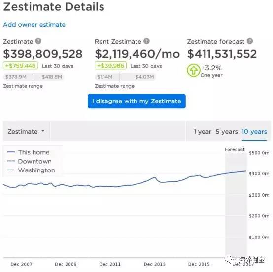 从2009年起,Zillow开始对白宫的价值进行评估,目前估价为3.98亿美元,月租金212万美元,是Zillow上最贵的房产。若按揭30年,每月还贷额为151万美元,Zillow的估值系统认为,在一年内,白宫的价值将达到4.11亿美元。