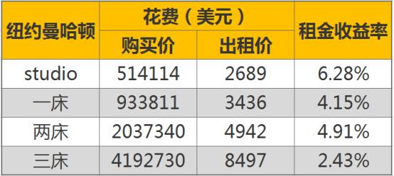 曼哈顿的房产整体表现良好,投资曼哈顿时,户型越小越有赚头,Studio(小单间)的租金回报率很容易达到6%以上。总体来看,目前纽约曼哈顿的豪宅价格有轻微回调,租金不变的情况下,租金收益率会有些许上升。