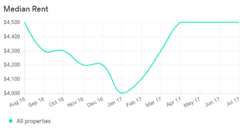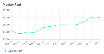 洛杉矶、旧金山租金差不多的情况下,房价更高的旧金山租金回报率自然就不高。旧金山的整体租价曾在今年1月经历了一次低位,约为4000美元/月,如今逐渐回升,从四月到七月保持在4500美元/月。