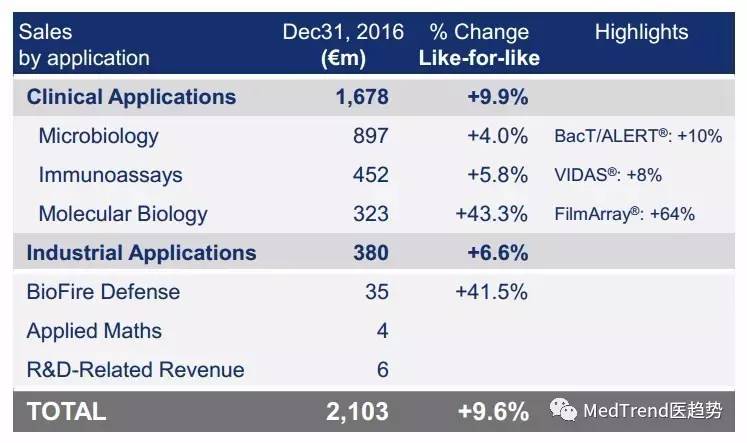2016年,微生物业务上涨4%,主要靠BacT/ALERT营收上涨10%;