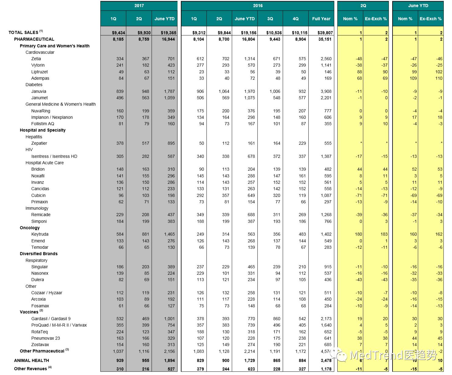 默沙东的抗丙肝药物Zepatier,是榜单中的新面孔,此药2016年2月才被批准上市,2017年上半年销售额就达到8.95亿美元,发展潜力可期。继2016年销售额同比增长148%之后,2017年PD-1抗体Keytruda继续大杀四方,仅用半年的时间就超越了2016年全年的销售额,同比增长260%。