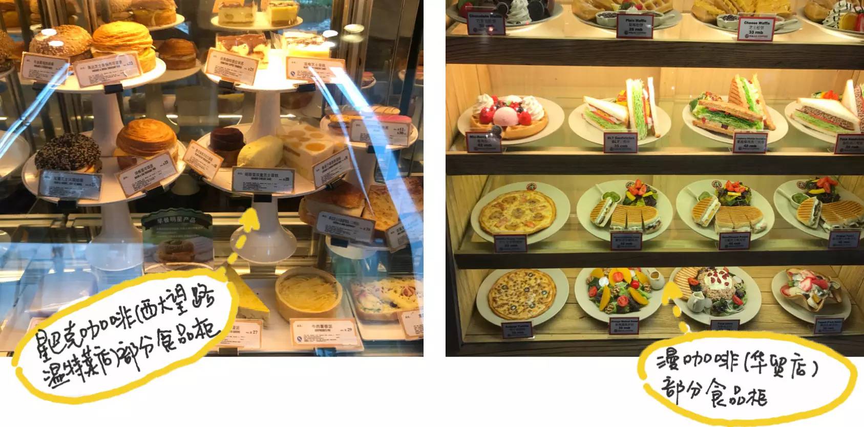 咖啡店之间的定位差异也直接反映在了他们的菜品上。星巴克更偏向于可店食也可外带的汉堡和蛋糕一类,而漫咖啡则有费心摆盘,为了让你好好在店里吃完这顿饭,然后再躺个尸。