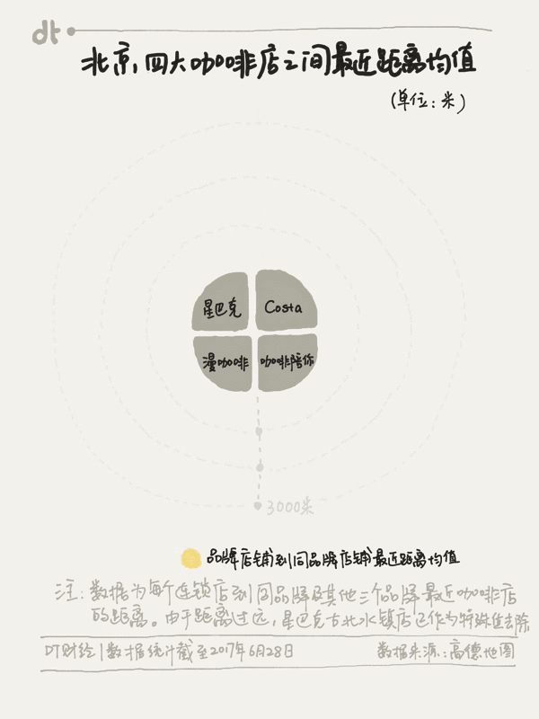 为了直观展现各个咖啡店的实际距离,DT君采集了每个咖啡店最近的四家不同咖啡店的距离数据,做出了这张咖啡店的貌合神离图。