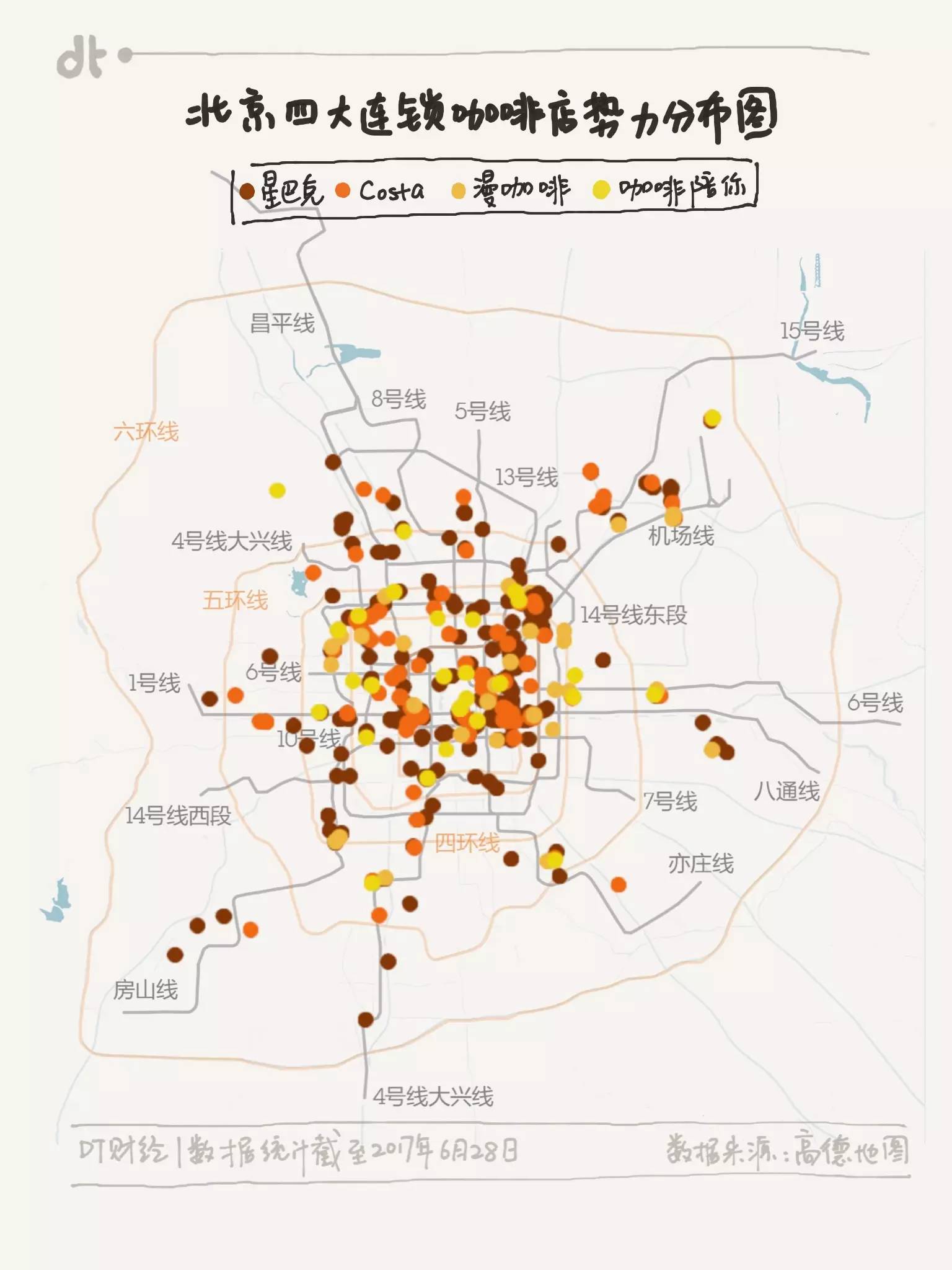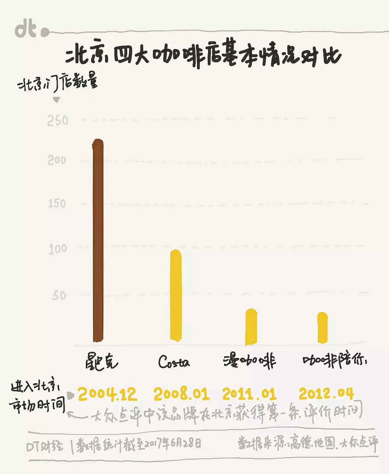 不过,只有这两位老熟脸,故事当然不够精彩。DT 君搜罗了高德地图上的北京咖啡店分类下的所有店铺数据,发现除了这两位老司机以外,还有两位后起之秀:漫咖啡和Caffebene(下称中文译名“咖啡陪你”)。