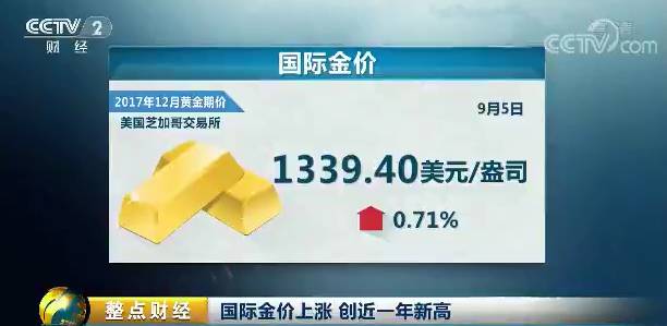 据央视财经报道,8月底以来,随着亚洲地缘政治危机的逐步升级,黄金避险情绪升温,国际金价一路走高,美国时间9月5号,12月份黄金期货价格盘中一度达到1345.50美元/盎司,创近一年新高。