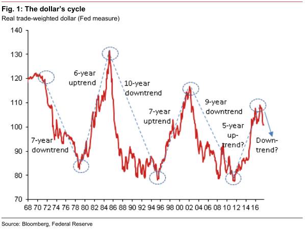 自二战以来,美元走势一直表现出“7年一涨,7年一跌”的规律。虽然“7”这个数字并不完全精确,却大致可以描述每个周期持续的时间。