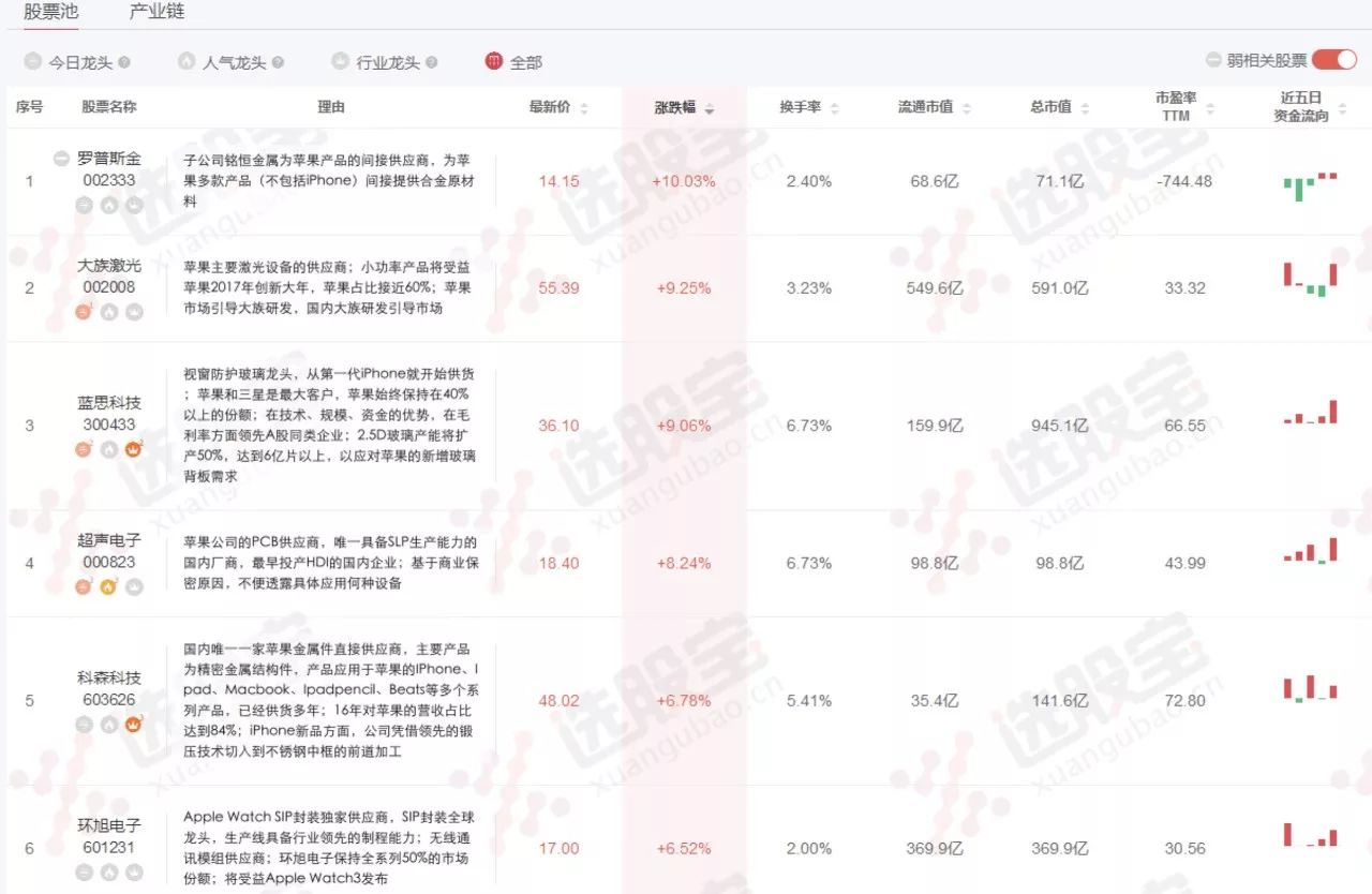 苹果周三收涨0.82%,刷新收盘纪录高位和盘中纪录高位至176.24美元,市值增长至9048.711亿美元,2017年内涨幅扩大至52.17%。受此消息刺激,午后苹果产业链个股单边拉升,其中罗普斯金强势封板,大族激光、蓝思科技均再创阶段新高。此前,苹果上周四公布财报显示,今年三季度盈利、营收和iPhone销量都高于市场预期,大中华区营收终结连续六季同比下降。苹果预计,在iPhone X开卖的四季度,销售额将创史上新高。
