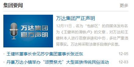 12月14日下午,万达集团在其官网发“严正声明”,称“12月11日,一个名为‘包邮区’的自媒体发布一篇名为《王健林的滑铁卢》的文章,对万达集团和王健林本人进行恶意诽谤和中伤,多处严重违背事实。”