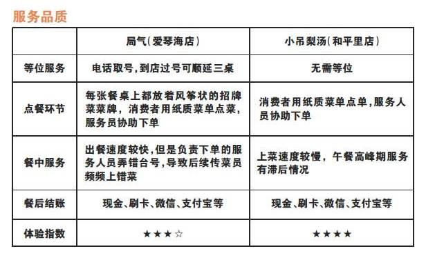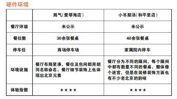 点评两家餐厅在不同的用餐高峰时期上座率都很高,可见两家京菜餐厅均拥有很高的人气。另外,两家餐厅的服务人员也普遍比较年轻,服务态度较好,但是在用餐高峰时段均出现不同程度服务滞后的情况,尤其是局气(爱琴海店)的服务人员弄错台号,给传菜员以及两桌消费者都带来很大不便,影响消费体验。