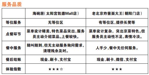 海碗居既保留了老北京饭馆的传统特色,也能做到细致、及时。老北京炸酱面大王的主动服务意识不强。