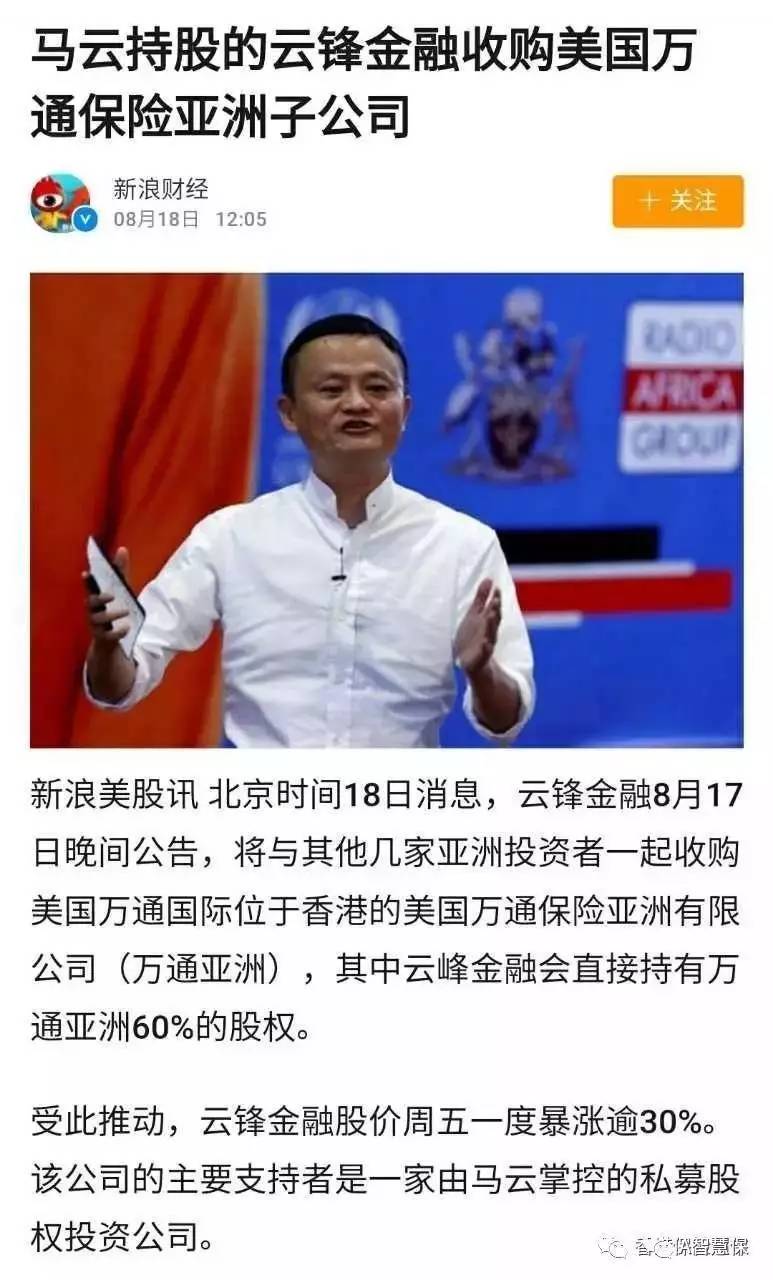 马云闯入保险业上演加速度。除了国内众安、国泰等,还要杀入香港保险市场。8月17日晚间,云锋金融宣布,将联合蚂蚁金服、新浪、新加坡政府投资公司等7家投资机构斥资131亿港币收购美国万通 香港和澳门的业务。
