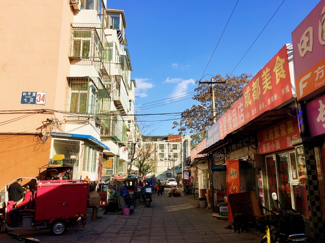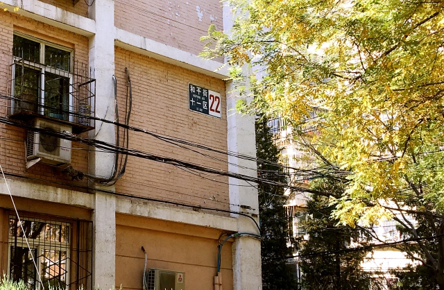 前几年,北京市开始对城里老小区进行保温改造,和平里的工程似乎并没有结束——那天下午,施工队还在忙着对老楼房进行加固、粉刷、安装保温板等,很多楼牌都是崭新的,阳光下,蓝白相间的颜色分外显眼。