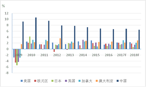 图2 2009-2018年主要经济体真实GDP增速(%)