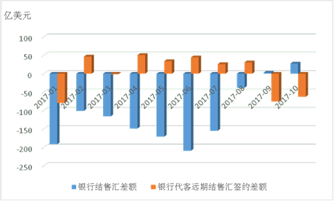 2017年以来,银行结售汇逆差规模在上半年逐步扩大,6月起收窄,9月后转为顺差;代客远期结售汇签约差额在2月至8月多保持净结汇(3月除外,-1.31亿美元),9月后转为净售汇,显示出从6月份开始,市场预期转向人民币升值.