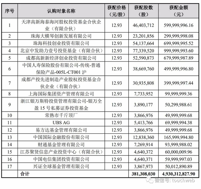 此次参与的17家对象分别是:天津高新海泰海河股权投资基金合伙企业(有限合伙),认购6亿元;珠海大横琴创新发展有限公司认购3亿元;珠海科技创业投资有限公司认购7亿元、北京中发助力壹号投资基金(有限合伙)认购10亿元、成都高新新经济创业投资有限公司认购6.8亿元;