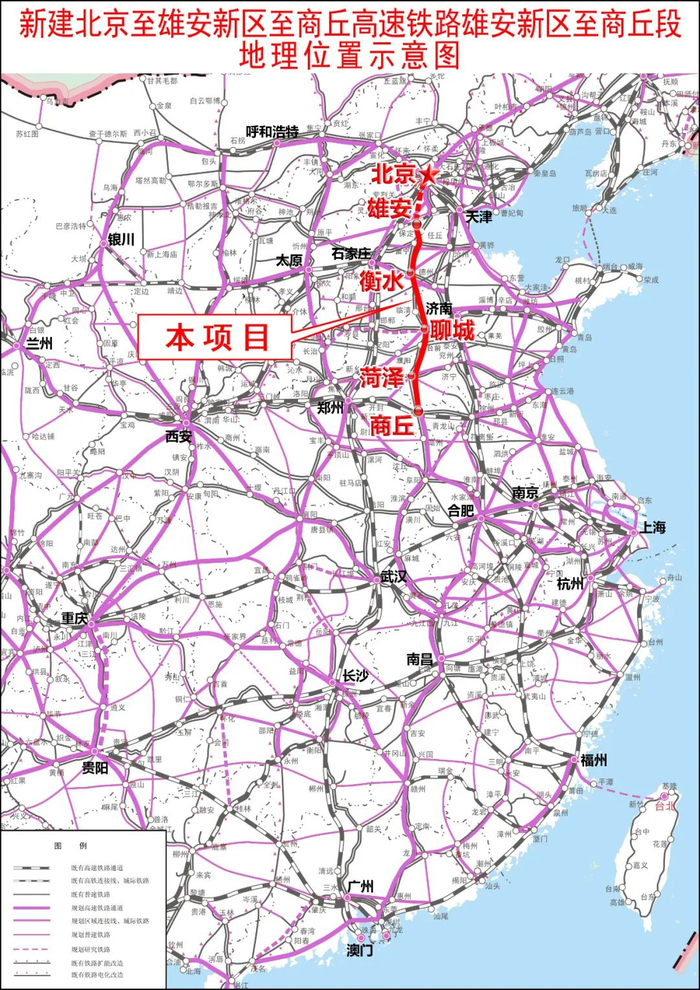 建设规模:雄商高铁位于京沪高速铁路、京广客运专线两大干线之间,基本沿既有京九通道,北起京雄城际雄安站,向南经河北省雄安新区、沧州市、衡水市、邢台市和山东省聊城市,在河南省濮阳市台前县跨黄河后,再经山东省济宁市、菏泽市、河南省商丘市至商合杭铁路商丘站。本线线路长度551.97公里,途经3省、9市25县(区),其中河北省境内257.82公里,山东省境内268.97公里,河南省境内25.18公里。全线正线桥梁521.47公里/16座,占线路长度94.47%;路基30.50公里,占线路长度5.53%。