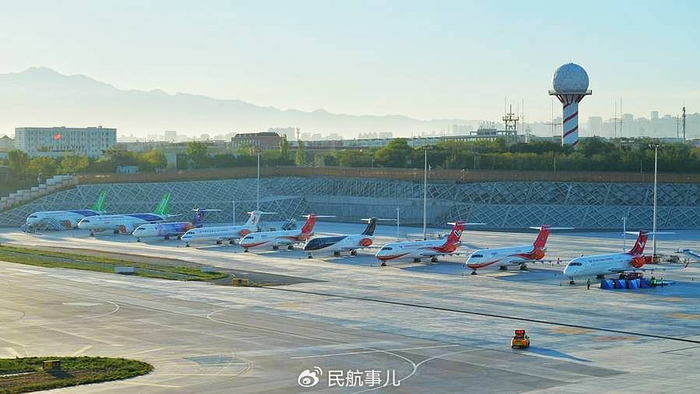 【民航事儿】9月26日,中国商飞7架ARJ21和2架C919飞机齐聚新疆乌鲁木齐地窝堡国际机场,“列队”进行静态展示。值得关注的是,7架ARJ21飞机中包含了公务机、医疗机、货机和应急救援指挥机,这是ARJ21飞机4款衍生机型首次同台亮相,标志着这款飞机正在规模化系列化发展道路上稳步推进。