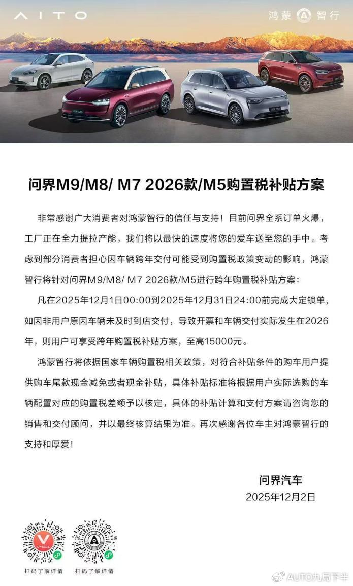 年末购车高峰期,为消除用户因政策变动产生的购车焦虑,近日,问界针对问界M9、问界M8、问界M7 2026款、问界M5推出了极具诚意的购置税补贴方案:2025年12月1日00:00至2025年12月31日24:00前完成大定锁单,如因非用户原因车辆未及时到店交付,导致开票和车辆交付实际发生在2026年,则用户可享受至高15000元购置税补贴。该补贴将以购车尾款减免或现金补贴形式发放,具体补贴标准将根据用户实际选购的车辆配置对应的购置税差额予以核定。