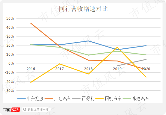 (来源:2021中国汽车经销商集团排行榜)对比同行,近五年来中升控股营收增速较快,增速领先同行可比公司,并且与行业营收体量第一的广汇汽车(600297.SH)差距逐步缩小。