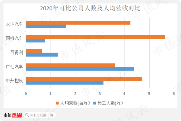 (来源:公司年报)2020年,中升控股员工人数3.1万人,比广汇汽车员工人数少了1.25万,但两家公司的营收相近。