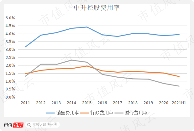 (来源:公司年报数据统计)营运能力有所提升且对比同行较为优秀,中升控股负债率也在持续降低。2021年中报,公司资产负债率为56%,有息负债率为26%,财务费用率降至0.7%。