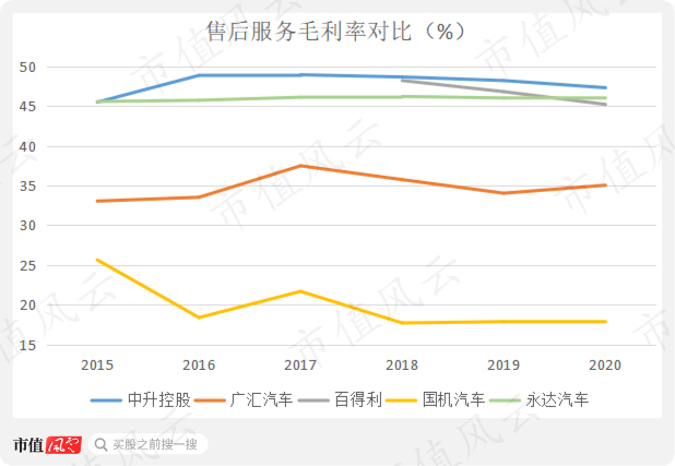 换算过来,2020年,公司售后及精品业务毛利率约为47%,而新车销售业务毛利率仅为3%。