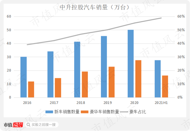 公司披露的汽车销量数据,近五年来销售的豪车销售占比逐年提高,2021年中,豪车销量为16.2万辆,占比达58.8%。