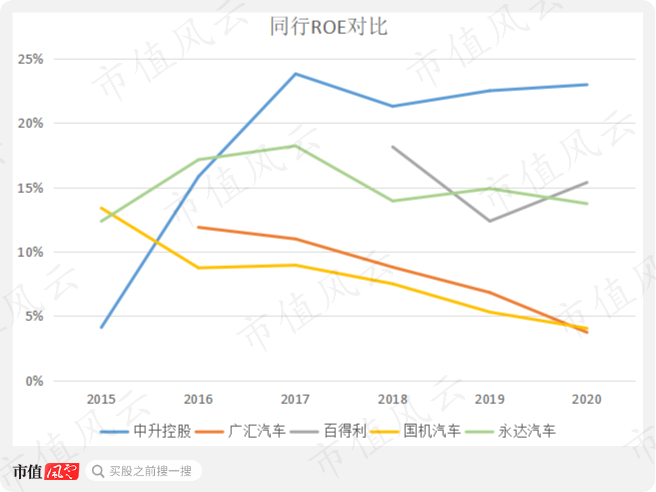 (来源:公司年报数据统计)2015年以来,中升控股利润率、营运能力提升,负债率下降,公司的净资产收益率(ROE)大幅提升。2020年,中升控股的ROE为23%,优于同行可比公司。
