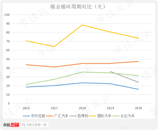 (来源:公司年报数据统计)2020年,百得利现金循环周期为24天,广汇汽车为47天,永达汽车(03669.HK)为31天,国机汽车(600335.SH)为73天。中升控股的现金循环周期同行对比较优秀,资金使用效率较高。