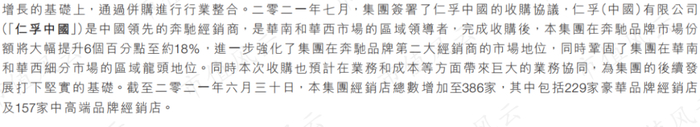 2021年7月,中升控股收购了仁孚(中国)有限公司,奔驰品牌中国市场份额从12%提升至18%。公司是奔驰品牌在中国的第二大经销商。