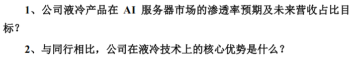 从最近两次的调研记录来看,市场对公司AI服务器液冷相关业务非常关注。
