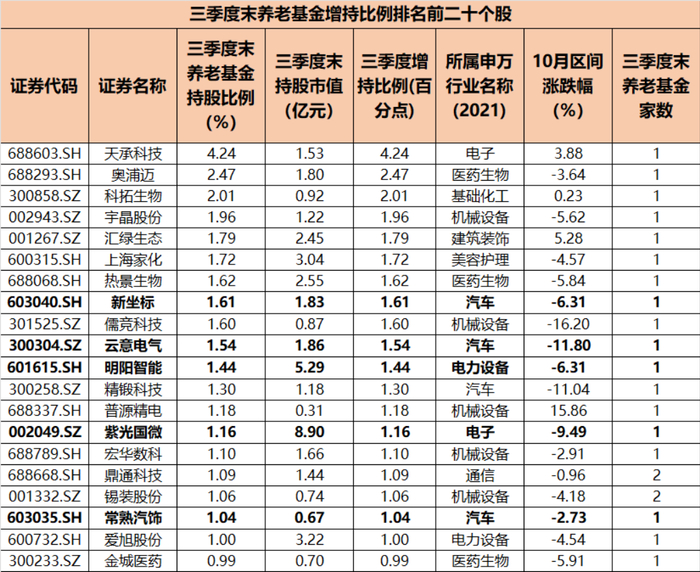 三季度,养老金积极调仓换股,增持方向多为成长题材,持有比例增加明显的多为机械设备、汽车、电子、通信等方向。