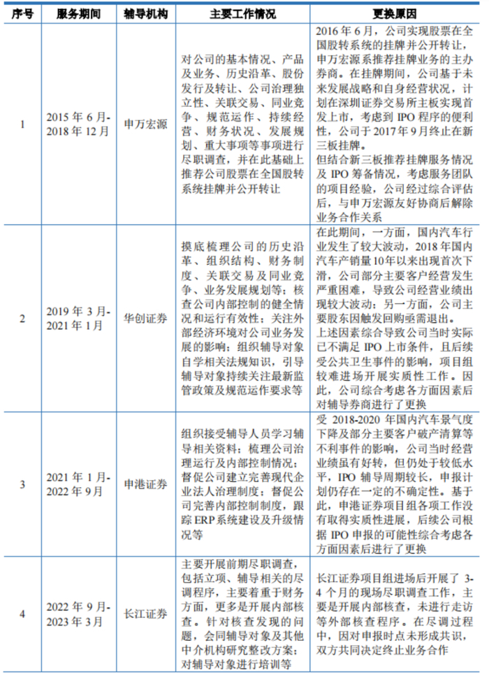 (来源:双英集团公告)在这期间,双英集团的辅导机构也在频繁更换,申万宏源、华创证券、申港证券、长江证券以及当前的国金证券,2018-2023五年内,公司保荐人前后共经历过四次变更。