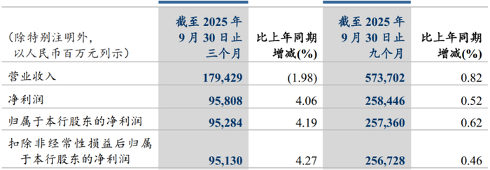 根据最新业绩,2025年前三季度,建行营业收入5737亿元,同比增长0.82%;归母净利润2574亿元,同比增长0.62%。